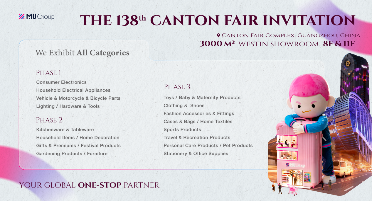 During the 138th Canton Fair, Market Union offers all-round sourcing support through a dual layout of "main booth + Westin showroom." We have 300+ booths across all three phases of the fair, alongside a 3,000 sqm exclusive Westin showroom, ensuring efficient access to high-quality suppliers across all categories.